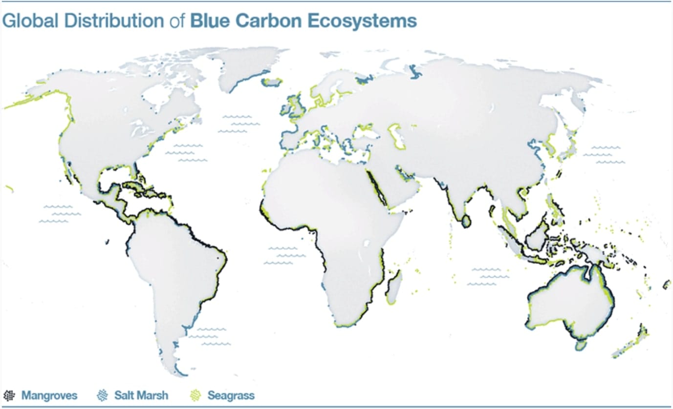 We’ve grown accustomed to hearing about the carbon sequestration potential of above-ground biomass, like trees, but the areas where ocean meets land holds vast potential. Blue carbon ecosystems, which include mangroves, salt marshes, and seagrasses are found along the coastlines of every continent except Antarctica.