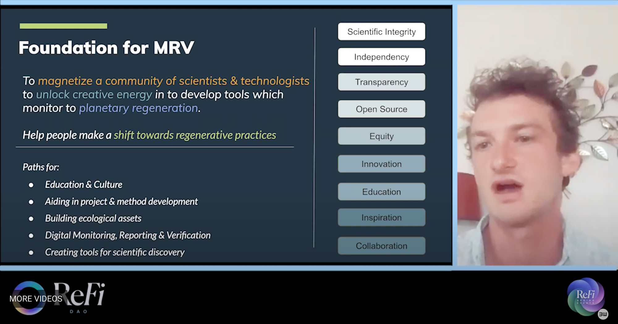 Raviv Turner spoke about the open MRV protocol that serves to ingest data, store, and serve data. This process is verified in a secure decentralized infrastructure. He went on to talk about his projects in Tierras Vivas, and Costa Rica and their goal of sequestering 6 million CO2 metric tons through regenerative grazing on 87,000 hectares of farmland. Lastly, the coalition is able to monitor this progress through remote sensing. This includes satellite imaging, NDVI NASA's LANCE data (land, atmosphere, near real-time, capability for EOS), and planes. Soil formation can be further monitored by electrochemical probes and microbial biosensors, which enables rapid and sensitive detection for environmental monitoring.